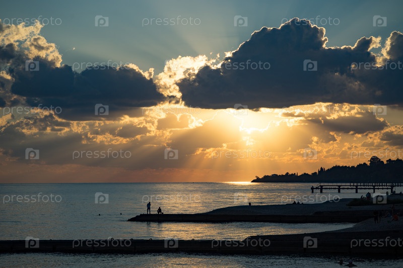 Береговая линия с пляжами, волноломами и силуэтом людей на фоне яркого заката
