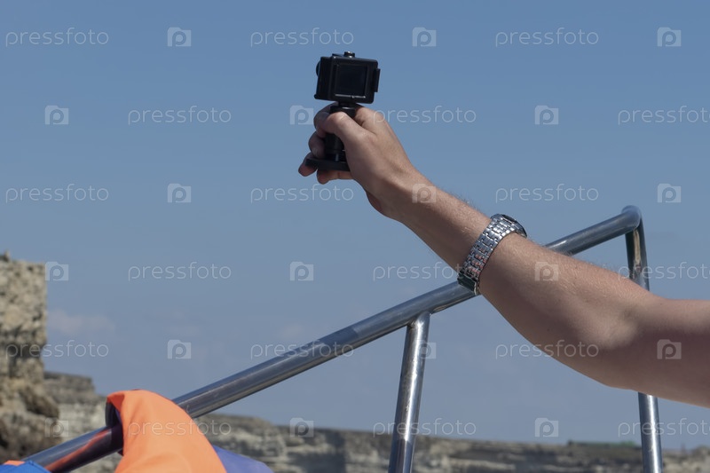 Пейзаж с видом на мужскую руку с экшн-камерой