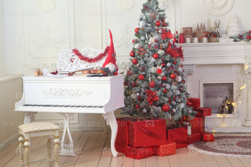 Новогодний интерьер с белым роялем,камином и елкой