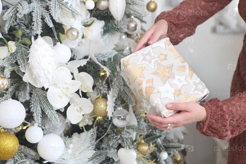 Женские руки держат подарок возле новогодней елки