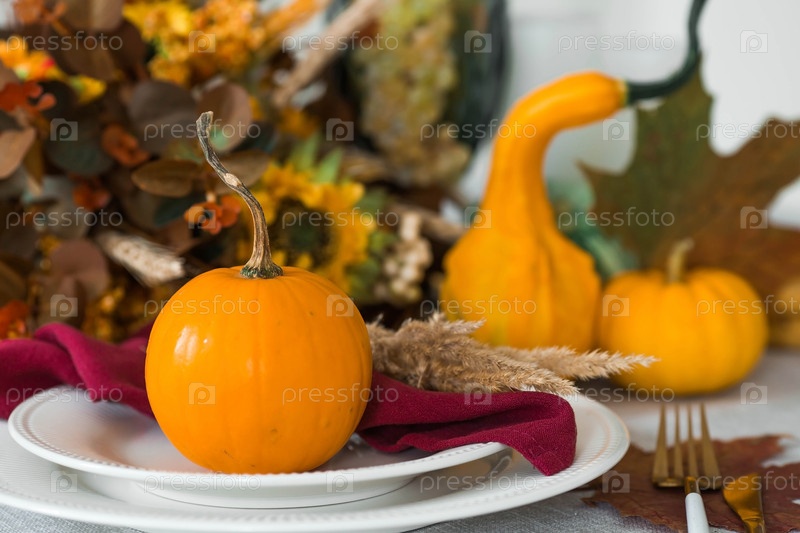 Красивая осенняя сервировка стола. Тарелка с хлопчатобумажной салфеткой и тыквой. Столовое золото и ваза с осенними цветами на льняной скатерти. Концепция праздничной сервировки на День Благодарения