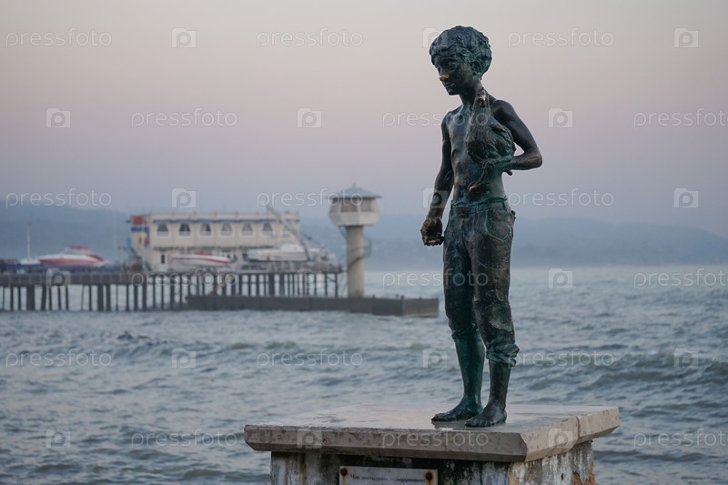 Морской пейзаж с видом на статую Нахального мальчика с курицей