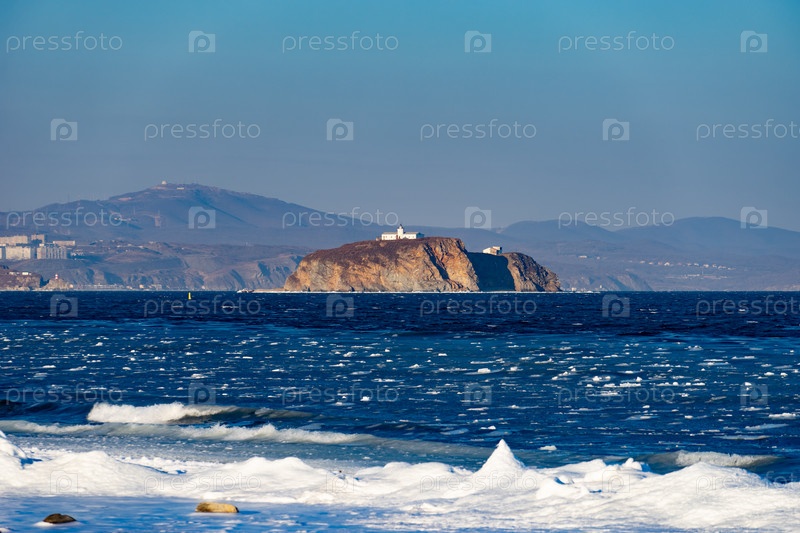 Остров на фоне морского пейзажа. Владивосток, Россия