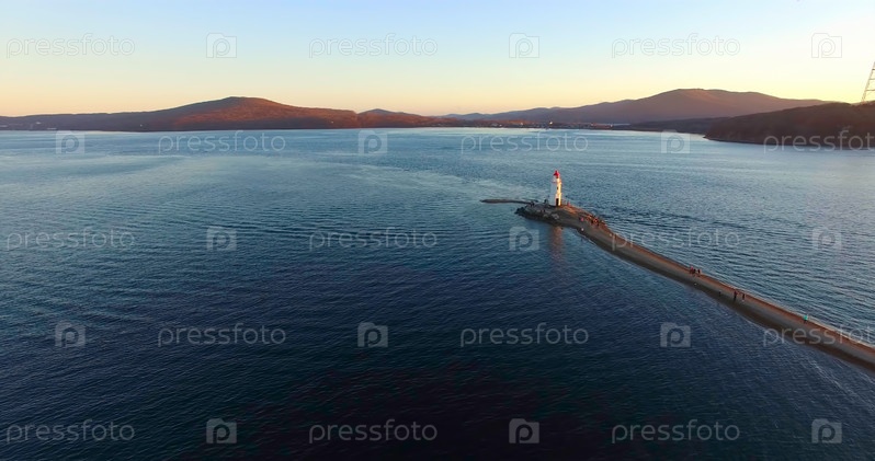 Вид с воздуха на морской пейзаж с маяком на горизонте