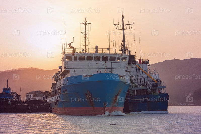 Владивосток, Россия. Старые корабли на закате на стоянке в заливе
