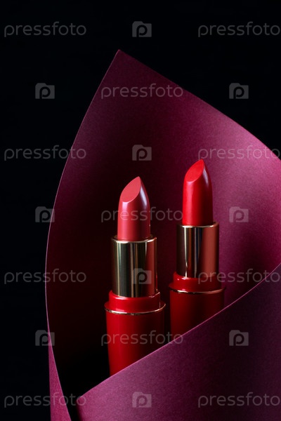 Помада двух цветов внутри красной бумаги, вырезанной на черном фоне. Низкий ключ. Креативная презентация косметического продукта