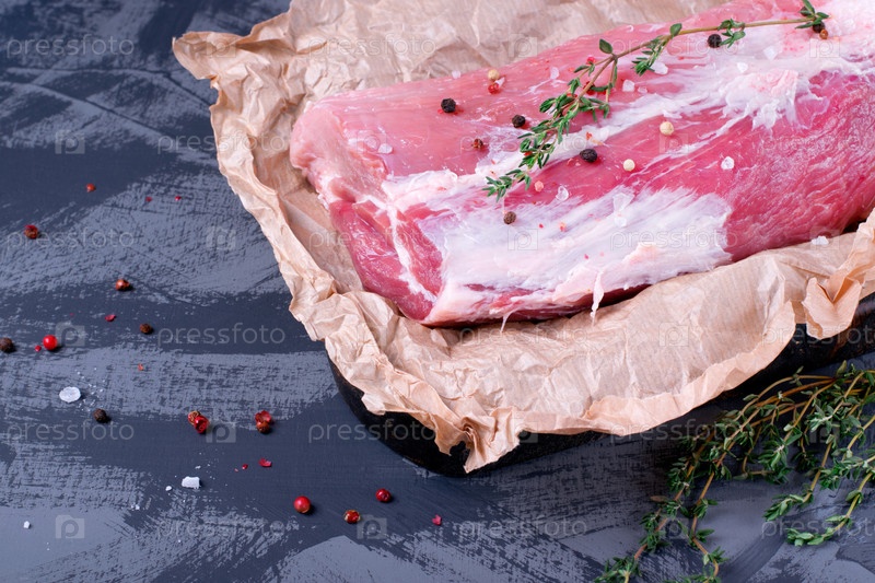 Сырое мясо шеи свинины с солью, перцем и тимьяном на куске пергаментной бумаги. Фермерский продукт
