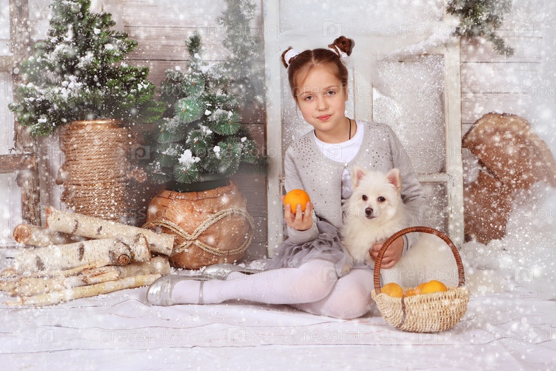 Девочка с белой собакой в новогодних декорациях