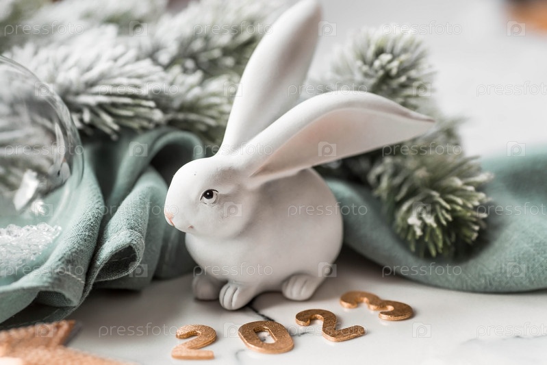 Красивая праздничная открытка. Концепция счастливого нового года и Рождества. Символ года — белый кролик на фоне еловых веток и цифры 2023