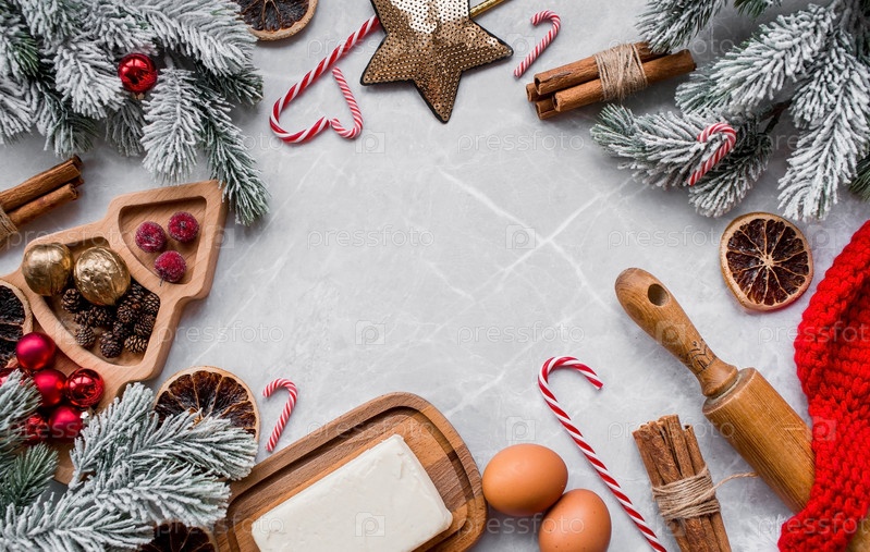 С Новым 2023 годом. Баннер с кухонной утварью, рождественскими украшениями, корицей, пряниками и елью на мраморном фоне. Поздравительная открытка на Рождество. Концепция кафе и ресторанов