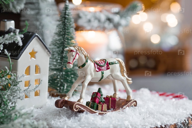 С Новым 2023 годом. Рождественская открытка, баннер с лошадкой-качалкой, елки, подарки и красивое боке на заднем плане. Концепция домашнего зимнего отдыха, тепла и уюта