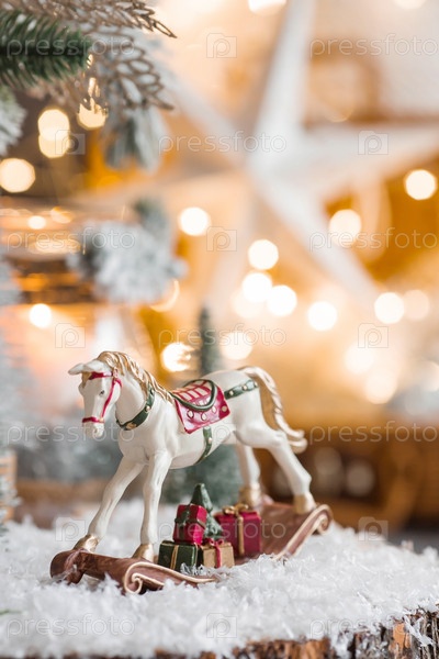 С Новым 2023 годом. Рождественская открытка, баннер с лошадкой-качалкой, елки, подарки и красивое боке на заднем плане. Концепция домашнего зимнего отдыха, тепла и уюта