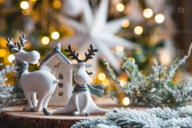 С Новым 2023 годом. Рождественская открытка, баннер с забавными оленями и елками на заднем плане - красивое боке. Новогодний натюрморт. Концепция домашнего праздника, тепла и уюта