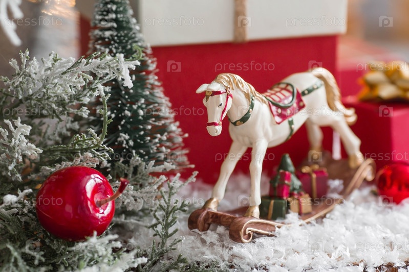 С Новым 2023 годом. Рождественская открытка, баннер с лошадкой-качалкой, елки, подарки и красивое боке на заднем плане. Концепция домашнего зимнего отдыха, тепла и уюта