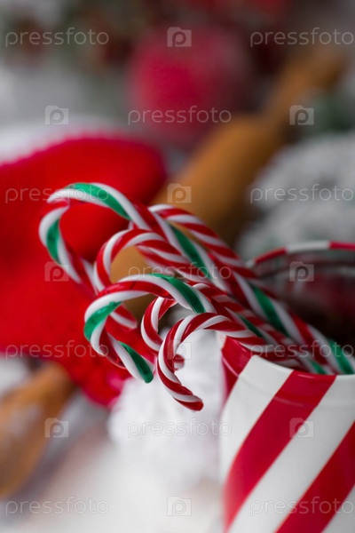 С Новым 2023 годом. Баннер. Полосатые леденцы в банке, место для копирования текста. Леденец трость. Поздравительная открытка на Рождество. Концепция магазина сладостей