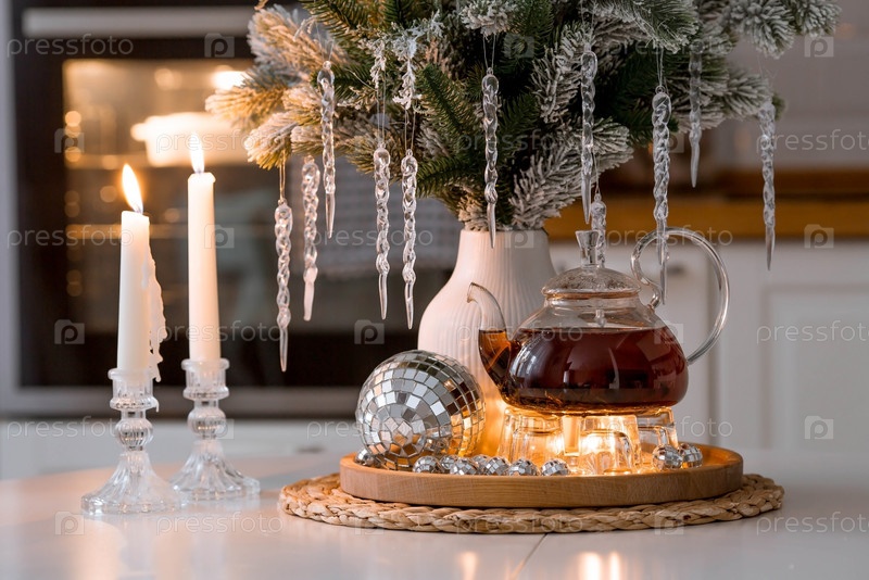Букет еловых веток с сосульками, свечи и чайник с чаем на деревянном столе в домашнем интерьере белой кухни в скандинавском стиле. Уютная концепция праздничных напитков