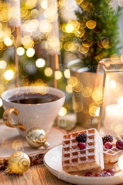 Образ жизни. Чашка чая, вафли, елка и свечи на деревянном столе на красивом фоне боке во время рождественских праздников. Натюрморт. Концепция домашнего тепла, уюта зимой