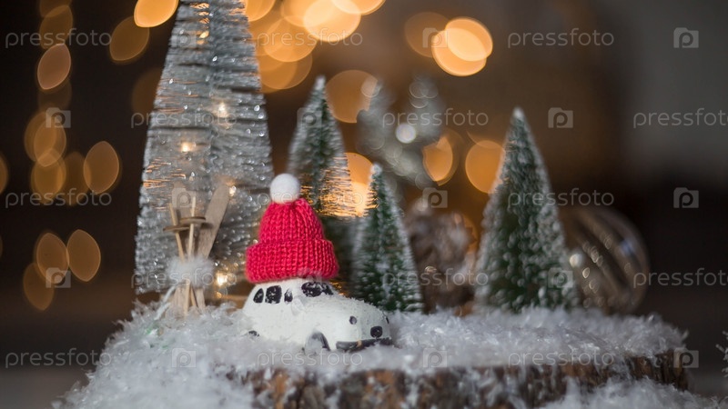 С Новым 2022 годом. Красивый фон с автомобилем с красной шапкой на крыше, елками и украшениями. Празднование зимних рождественских каникул. Концепция начала года