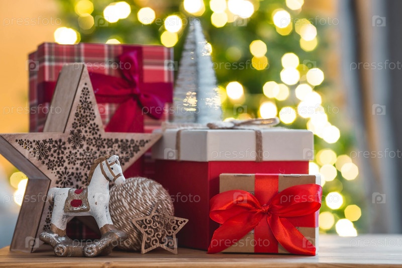 Подарочные коробки на столе в домашнем интерьере гостиной. Уютная концепция новогодних и зимних праздников 2022. Готовим подарки для близких