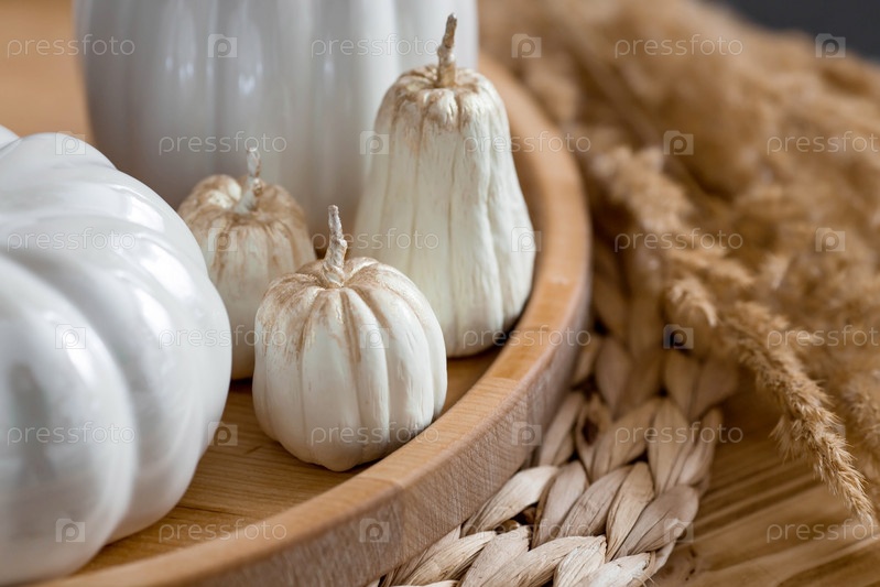 Натюрморт. Белые керамические тыквы, пампасная трава, свечи в форме тыквы на журнальном столике в домашнем интерьере гостиной. Детали декора. Уютная осенняя концепция