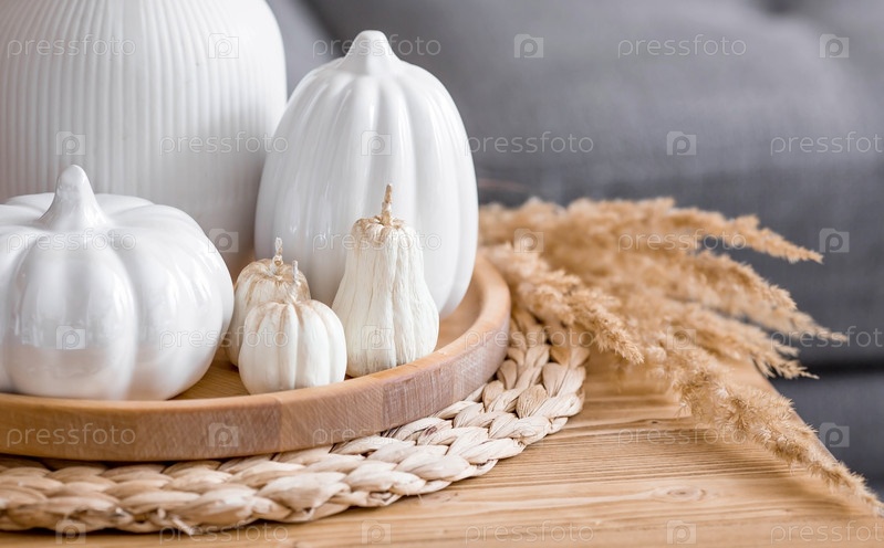 Натюрморт. Белые керамические тыквы, пампасная трава, свечи в форме тыквы на журнальном столике в домашнем интерьере гостиной. Детали декора. Уютная осенняя концепция