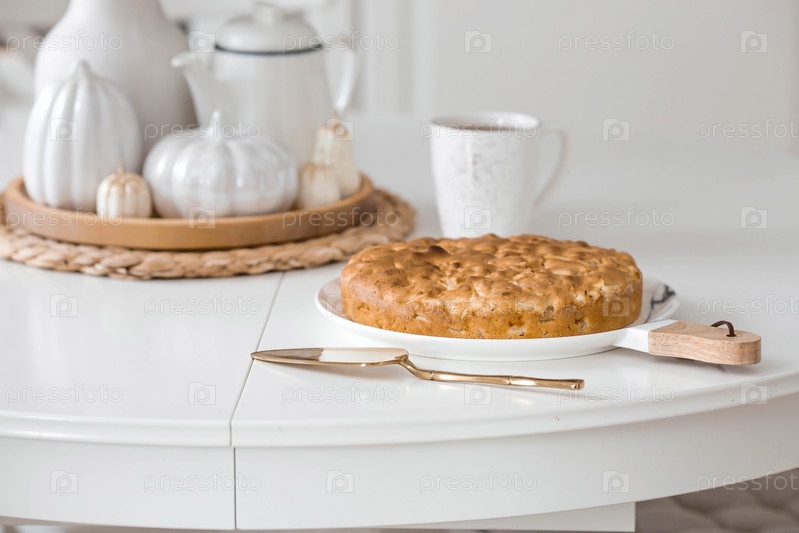 Натюрморт. Сушеная пампасная трава в вазе, белые керамические тыквы, свечи и шарлотка из яблочного пирога на белом столе в интерьере домашней кухни в скандинавском стиле. Уютная осенняя концепция