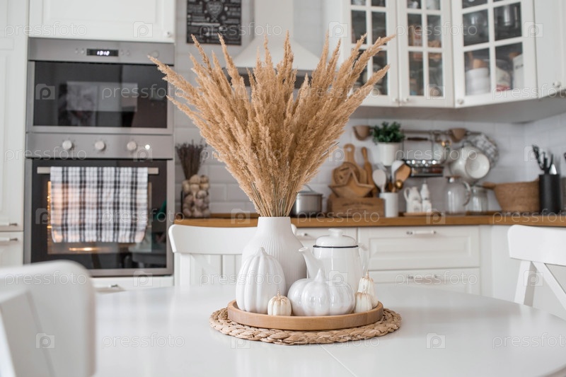 Натюрморт. Сушеная пампасная трава в вазе, белые керамические тыквы, чайник и свечи в форме тыквы на белом столе в интерьере домашней кухни в скандинавском стиле. Уютная осенняя концепция