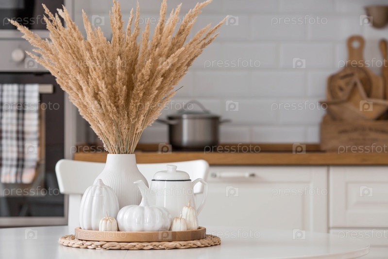 Натюрморт. Сушеная пампасная трава в вазе, белые керамические тыквы, чайник и свечи в форме тыквы на белом столе в интерьере домашней кухни в скандинавском стиле. Уютная осенняя концепция