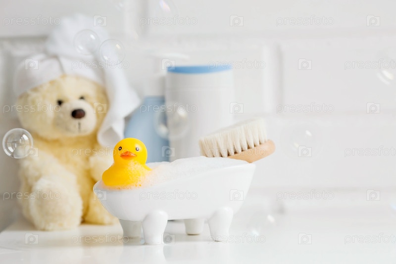 Детские банные принадлежности. Забота о ребенке. Мишка с полотенцем на голове, щеткой и бутылочками с шампунем. Миниатюрная пена для ванны и желтый резиновый утенок для купания