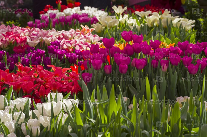 Яркие разноцветные тюльпаны. Традиционная ежегодная выставка "Репетиция весны" в в Аптекарском Огороде (филиал ботанического сада МГУ). Москва