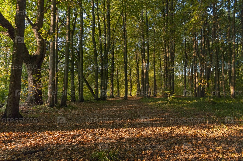 Полоски света и тени на опавшей листве на тропинке в осеннем лесу. Начало сентября. Битцевский лесопарк, Москва, Россия