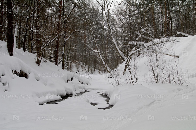 Ручей в зимнем лесу. Конец февраля. Битцевский лес, Москва. Верховья реки Чертановка