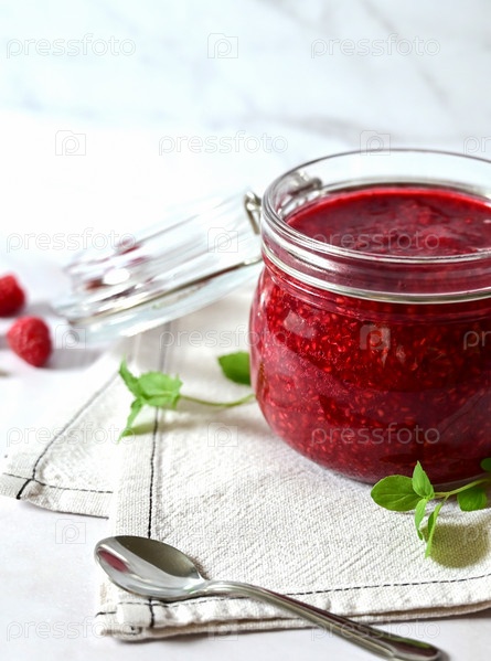 Малиновое варенье в стеклянной банке на белом фоне, чай с малиной, витамины для тела