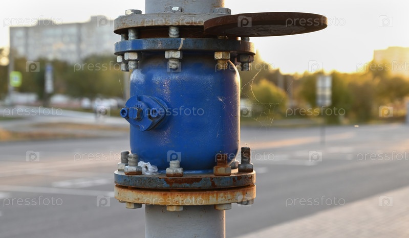 Голубая газовая труба с краном идет по фасаду нового многоэтажного дома. Дом подключен к газу для бытовых нужд