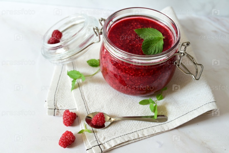Малиновое варенье в стеклянной банке на белом фоне, чай с малиной, витамины для тела