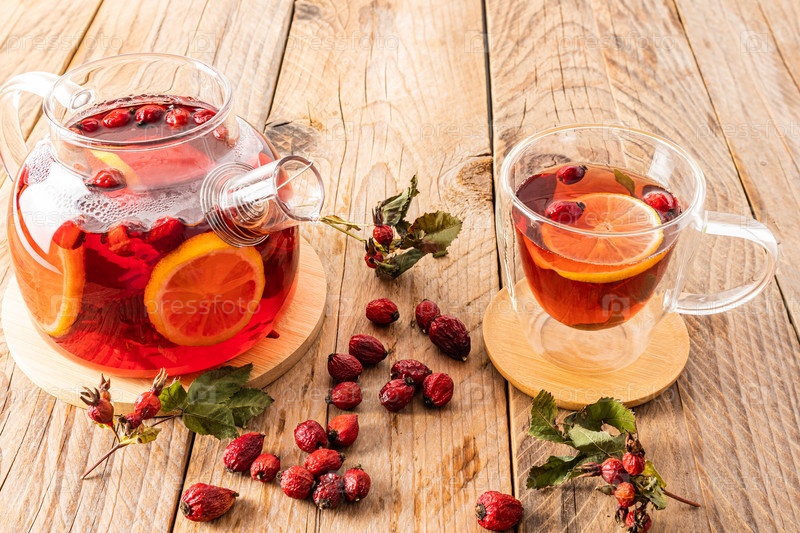 Большой стеклянный чайник с отваром ягод шиповника и чаем в стеклянной чашке с двойным дном на деревянном столе среди сухих ягод. витаминный чай
