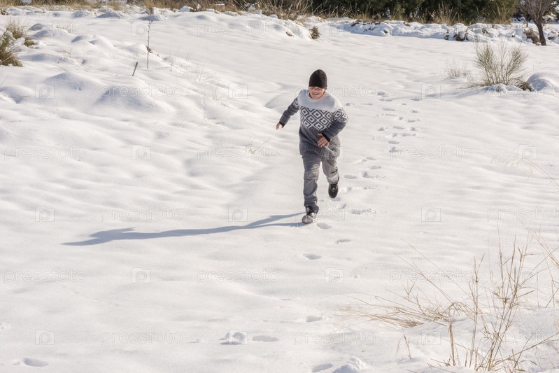 Ребенок бежит по снегу в солнечный день,