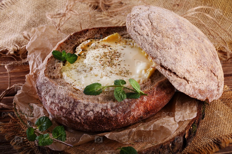Камамбер в буханке хлеба с веточкой мяты на деревянном столе
