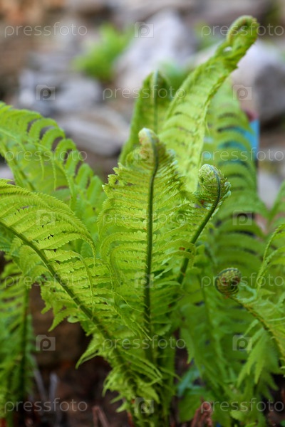Куст папоротника возле декоративных камней