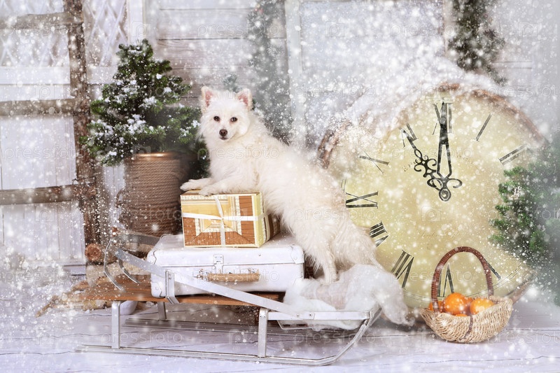 Белая собака в новогодней фотостудии
