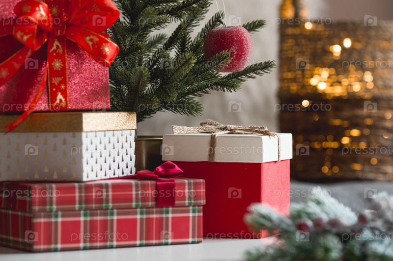 Подарочные коробки, ель и олени на столе в домашнем интерьере гостиной. Уютная концепция новогодних и зимних праздников 2022. Подготовка подарков близким