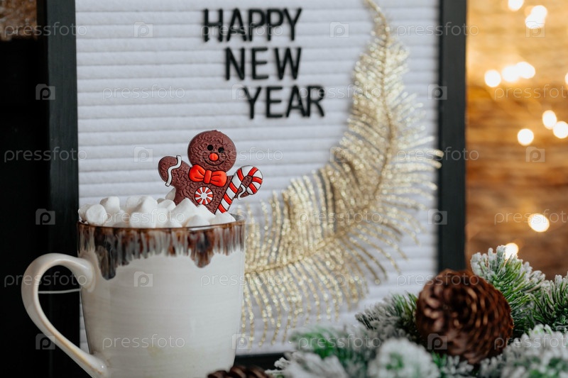 Табличка с надписью «С Новым годом», кружка с горячим какао, зефир и пряничный человечек на фоне красивого желтого боке. Уютная концепция Рождества и зимнего отдыха