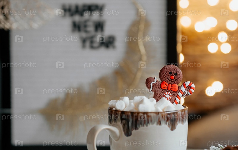 Табличка с надписью «С Новым годом», кружка с горячим какао, зефир и пряничный человечек на фоне красивого желтого боке. Уютная концепция Рождества и зимнего отдыха