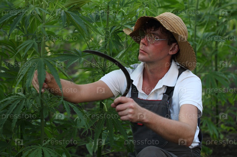 Фермер работает на конопляном поле. Срезает лишние растения серпом