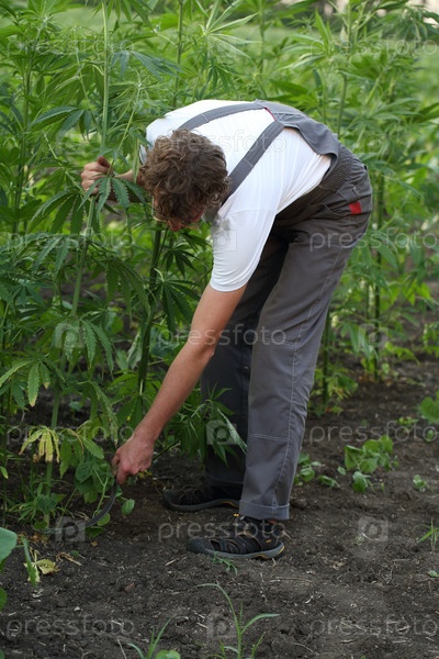Фермер работает на конопляном поле. Срезает лишние растения серпом