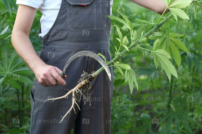 Фермер работает на конопляном поле. Срезает лишние растения серпом