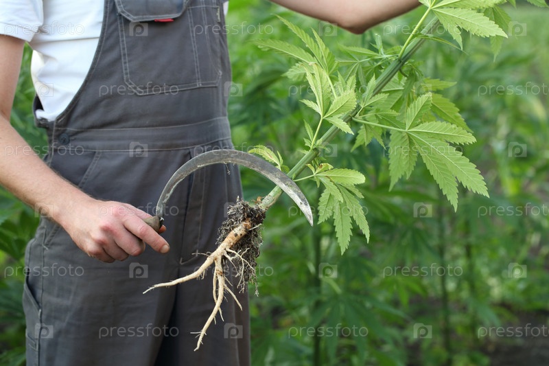 Фермер работает на конопляном поле. Срезает лишние растения серпом