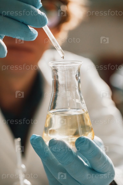 Конопляное масло, ученый держит бутылку масла. Лечение травами, Альтернативная медицина. Диетическое масло