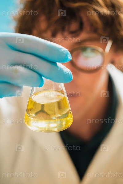 Конопляное масло, ученый держит бутылку масла. Лечение травами, Альтернативная медицина. Диетическое масло