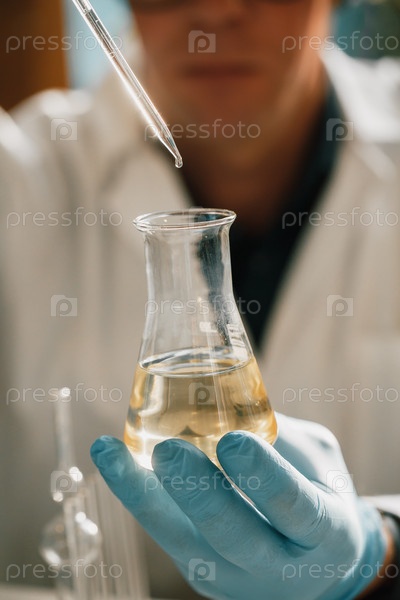 Масло из конопли CBD, ученый держит бутылку масла каннабиса против растения марихуаны